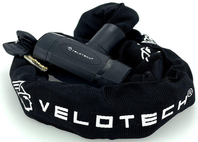 LÁNCOS LAKAT Kulcsos zár 8 mm vastag és 900 mm hosszú. Biztonsági zárbetét. Kerékpár lezáró titán-acél ötvözet. Szín: fekete gyöngyvászon borítással. VELOTECH logóval.