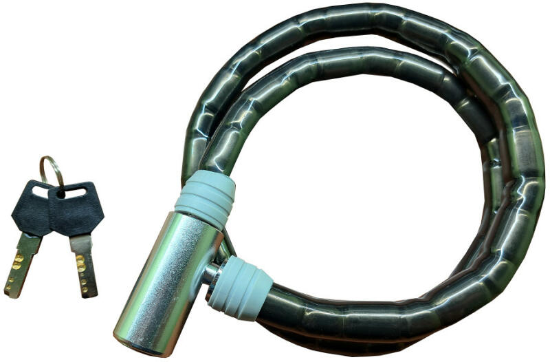 Flexibilis kerékpár vagy motor lakat. Gömb csatlakozású acélhengerek által nagyobb biztonságot nyújt a vékony drótkötélből készült társainál. Segítségével nagyobb biztonságban tudhatjuk a kerékpárunkat. Kábel átmérő: 18mm Kábel hossz: 800mm Zárás: hengerzár 2 darab fúrt kulccsal