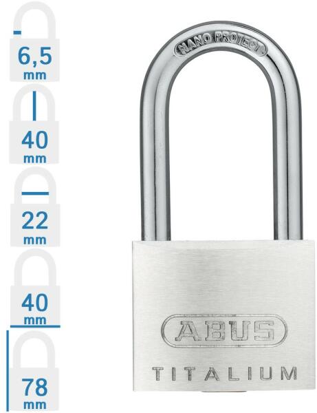 ABUS 64TI/40 HB40 lakat (727TI/40 HB40 KA): azonos zárlatú, egykulcsos lakatok, mely tetszőleges számban rendelhetők azonos kulccsal (gyárilag azonos kulcsos kivitel). Speciális ötvözetű Abus Titalium lakat kétoldali golyós reteszeléssel. Acél kengyel, 14,5 mm-es lakat test mélység. Minőségi ABUS zárbetét, utánrendelési lehetőség! Kulcsok száma: a rendelt mennyiség x 2, a