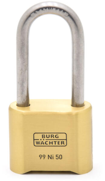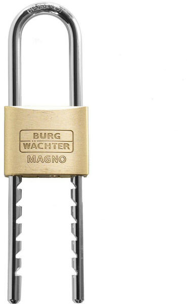 Burg Wachter-Magno 400 E HB 50 Flex állítható kengyelű biztonsági lakat hosszú kengyeles réz lakat állítható magasságú edzett acél kengyel kettős reteszeléssel nagy szakítószilárdság precíziós cilinderzár kettő darab kulccsal nagyszámú zárvariáció rozsdamentes belső szerkezet azonos záródással is rendelhető nyerskulcs típusa: 68R