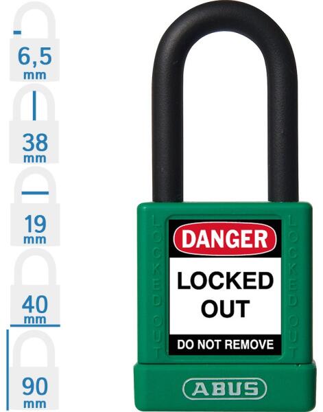 ABUS 74/40 LOTO munkavédelmi kizáró lakat (méret: lásd a képen): speciális ötvözetű Abus lakat kétoldali golyós reteszeléssel. Acél kengyel, 20 mm-es lakat test mélység. Az ABUS 74/40 LOTO munkavédelmi kizáró lakat 10 különböző színben rendelhető! Minőségi ABUS zárszerkezet, 1 db kulcs. Szigetelt, különösen hőálló – forró és elektromos környezetben is haszná