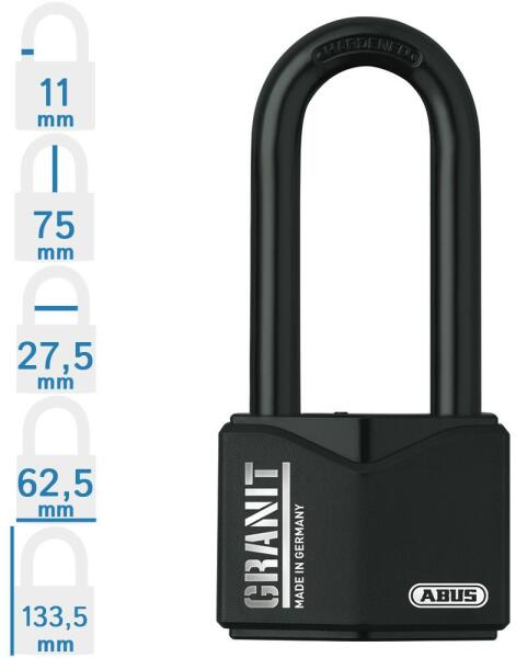 Abus Granit 37/55HB75 biztonsági acél lakat. Minőségi Abus Plus lamellás zárbetét, 2 db kulccsal. Kulcsmásolás kódkártyával. Masszív lakatház; edzett acél kengyel, kettős, golyós reteszelés. Méret: lásd a képen. ABUS Plus lamellás zárszerkezet: Maximális védelem a manipulációval szemben, különösen magas zárlati variáció Edzett, speciális acélból készült test