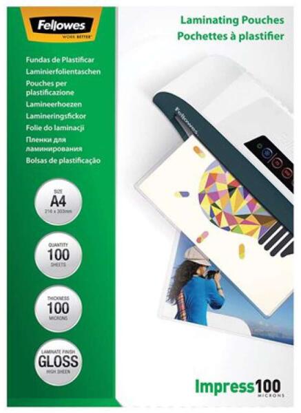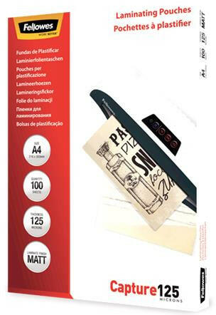 Meleglamináló fólia, 125 mikron, A4, matt, 100 db, FELLOWES - Méret: A4 - Vastagság: 125 mikron - Felület: matt - Védelem szintje: fokozott - Alkalmazható pl. értesítések, fényképek, tanúsítványok laminálására, továbbá hobbi és kézművesség területen - Kiszerelés: 100 db/csomag - A tökéletes végeredmény és a kiemelkedő megbízhatóság érdekében Fellowes® laminá