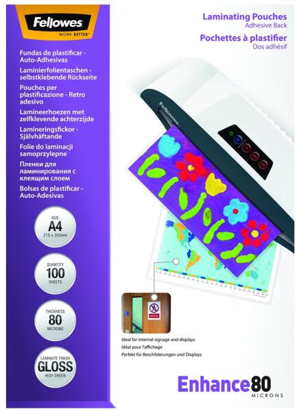 Meleglamináló fólia, 80 mikron, A4, matt, 100 db, FELLOWES - Méret: A4 - Vastagság: 80 mikron - Felület: matt - Védelem szintje: alap - Alkalmazható pl. értesítések, fényképek laminálására - Kiszerelés: 100 db/csomag - A tökéletes végeredmény és a kiemelkedő megbízhatóság érdekében Fellowes® laminálógépekhez mindig használjon Fellowes® lamináló fóliákat!