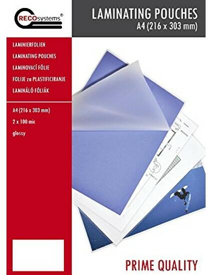 RECOsystems lamináló, minőségi fólia. Méret: A4. Fóliavastagság: 2 x 80 mikron. Fényes, hátoldalán öntapadós. Csomagolási egység: 100 db/csomag.