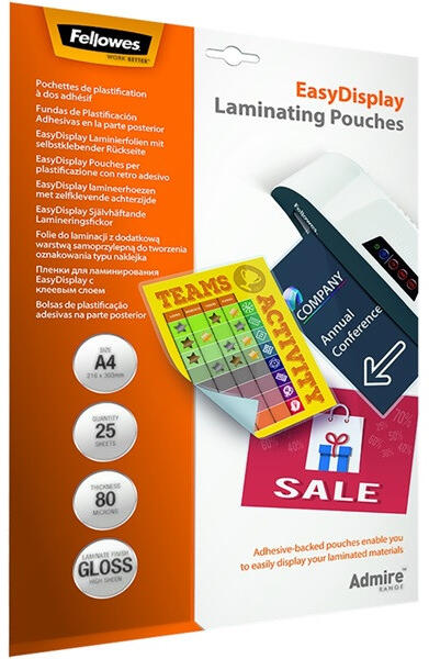 Fellowes A4 80mic öntapadó hátlapos 25db-os fényes lamináló fólia - Méret: A4 - Vastagság: 80 mikron - Felülete: Fényes - Kiszerelés: 25 db/csomag - Speciális típus: öntapadó hátlappal - Tökéletes értesítések, jelzések laminálására - Védelem szintje: alap - A tökéletes végeredmény és a kiemelkedő megbízhatóság érdekében Fellowes® laminálógépekhez mindig ha