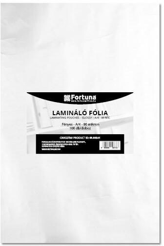 Lamináló fólia FORTUNA A/4 216x303mm 80 mikron fényes 100/dob Technológia: meleglaminálás. Alkalmazható: értesítések, szórólapok, fényképek laminálására