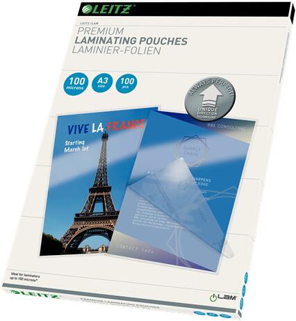 Leitz iLAM meleglamináló fólia, 100 mikron, A3, Fényes, UDT technológiával Egyszerűen használható, elakadásmentes meleglaminálás az UDT fóliákkal. A különleges prémium minőségű fóliák tökéletes védelmet biztosítanak a szennyeződések, folyadékok és a pára ellen. Jellemzők Könnyű fóliabehelyezés a Unique Direction Technology segítségével - a helyes irányt muta