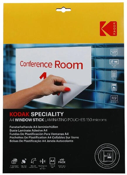 Kodak A4, 150 micron, 10 db/csomag üvegre tapadó fényes lamináló fólia A lamináló fólia hátsó felülete tapadó, így dokumentumokat, fotókat könnyedén felhelyezhet üveg felületekre. Letörölhető, tiszta és tartós. Kodak minőség, amiben biztos lehet. 21x29,7 cm (A4) 10 darabos kiszerelésben. 150 micron fóliavastagság.