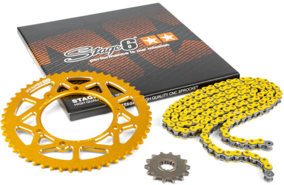 Első lánckerék sárkidobós JTF 1901SC. 13 - hátsó lánckerék acél JTR 897.52 - DID Japan meghajtólánc 520. DZ. 120-GOLD aranyozott, nem gyűrűs, erősített - lánc hossz: vagy a gyári, vagy annál hosszabb láncot szállítunk, a lánc levágható a kívánt hosszra - az itt jelzett gyári áttételtől bármilyen eltérő fogszámú lánckereket is tudunk szállítani. Biztosítani t
