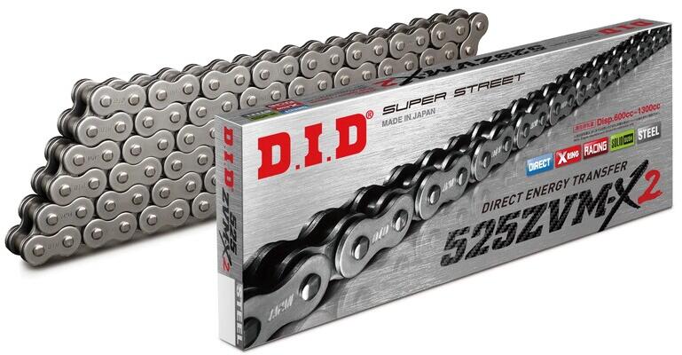 D. I. D egy japán gyártója magas teljesítményű áttételi alkatrészeknek, amely világszerte híres a láncainak és lánc készleteinek minőségéről. Ez a márka szorosan kapcsolódik a versenymotorozáshoz, és láncait számos világbajnoki csapattal együttműködve fejleszti. ZVM-X2 típusú lánc X-Gyűrű kapcsokból áll Olyan gépekhez tervezve, amelyek nagy motorteljesítménn