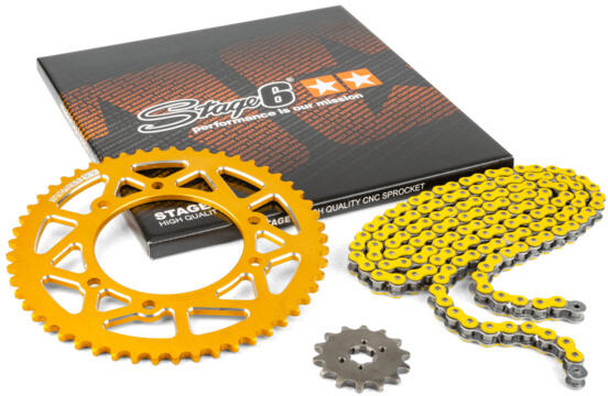 Első lánckerék sárkidobós JTF 1901SC. 13 - hátsó lánckerék acél JTR 897.48 - DID Japan meghajtólánc 520. DZ. 120-GOLD aranyozott, nem gyűrűs, erősített - lánc hossz: vagy a gyári, vagy annál hosszabb láncot szállítunk, a lánc levágható a kívánt hosszra - az itt jelzett gyári áttételtől bármilyen eltérő fogszámú lánckereket is tudunk szállítani. Biztosítani t