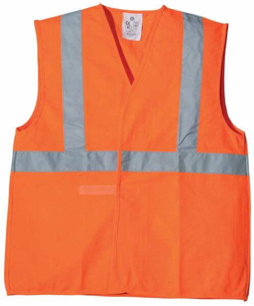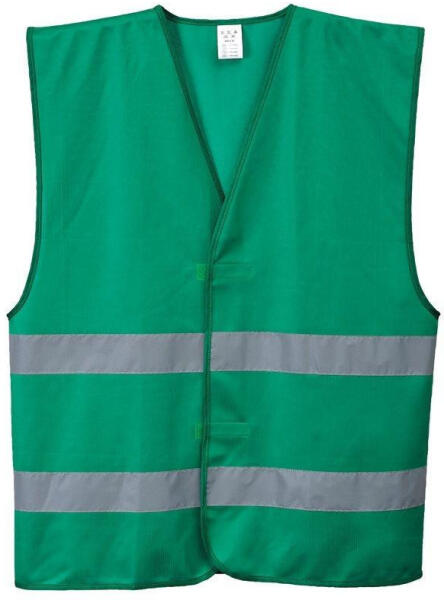 jó láthatóságú fluo sárga színű mellény szellőző, könnyű 120 g/m2 vastag, 100% poliészter alapanyag 5 cm széles fényvisszaverő csíkok: 2 keresztben és 2 hosszában a vállon át tépőzárral állítható bőség