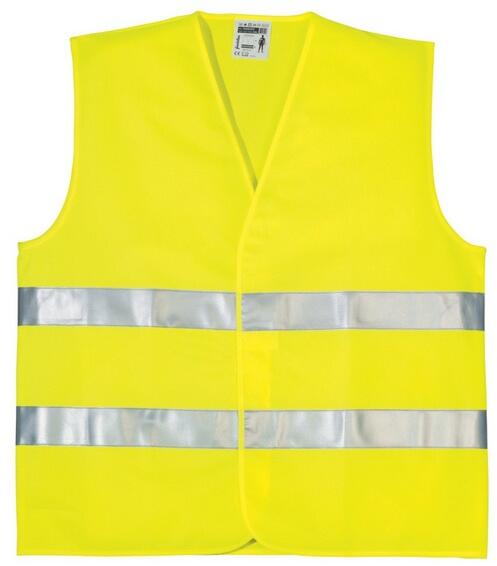 Szellőző, könnyű 120 g/m2 poliészter anyag, jól láthatósági színekben, egy kereszt, egy hosszanti, 5 cm széles fényvisszaverő csík, tépőzárral állítható bőség, univerzális XL méret, jól láthatósági sárga szín