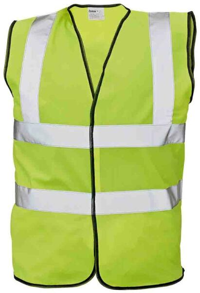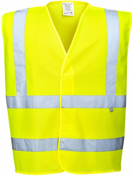 Jól láthatósági mellény Alapanyag: 100 % poliészter A termék megfelel az EN 340, EN 471 szabványoknak. Jól láthatósági mellény fényvisszavető csíkokkal, EN 471: 2,2 3 fényvisszavető csíkkal amiknek a szélessége 5 cm Tépőzáras, fekete kontrasztos szegéssel