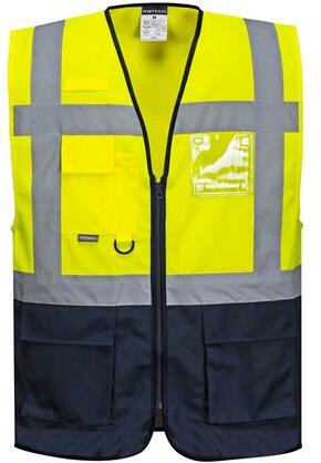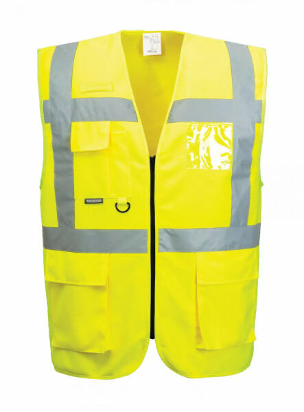 Poliészter jól láthatóságot biztosító munkavédelmi mellény, egyedi praktikus megoldásokkal: többfunkciós zsebek, mobiltelefon tartó zseb, zippzáros záródás. A dupla azonosítókártya tartó zseb lehetővé teszi álló és fekvő tájolású azonosító kártya elhelyezését is. Könnyen hozzáférhető, elülső zippzár nyílással és két kisebb zsebbel van ellátva. A „D