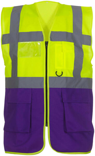 Uniszex ujjatlan Biztonsági mellény munkaruha Yoko Fluo Executive Waistcoat S, Fluo sárga/Lila Leírás: 125 g/m2 100% poliészter védőmellény vízszintes és függőleges fényvisszaverő csíkkal elöl és hátul tépőzáras mobiltartó zseb kulcs- és igazolvány tartó a mellrészen két tépőzáras oldalzseb cipzárral záródik. Figyelem! (Az anyag magas hőfokon hamarabb amortizál