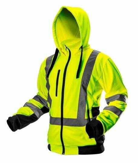 Kapucnis pulóver, fényvisszaverő, sárga, modell VISIBILITY, XL/56 méret, NEO A NEO jól látható kapucnis pulóver praktikus megoldás, amely növeli a felhasználó biztonságát, és jelzi jelenlétét minden nappali fényviszonyok között, de mesterséges fényviszonyok között sötétben is. A belső rész poláris gyapjúból készül, hogy alacsonyabb hőmérsékleten dolgozva kénye