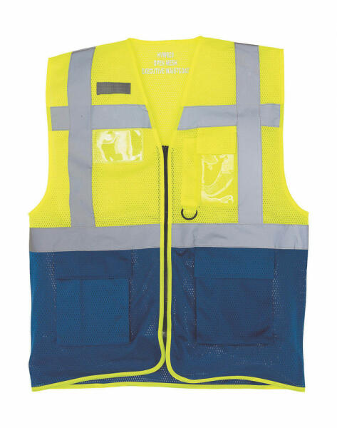 Uniszex ujjatlan Biztonsági mellény munkaruha Yoko Fluo Open Mesh Executive Waistcoat 2XL, Fluo sárga/Királykék Leírás: 110 g/m2 100% poliészter légáteresztő, könnyű hálós anyagból bal mellkasnál mobiltartó zseb, jobb mellkasnál igazolványtartó zseb, tolltartó zseb és kulcstartó alján 2 hajtókás zseb, mely oldalról is hozzáférhető 5 cm széles fényvisszaverő csík