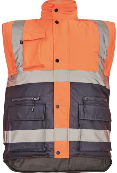 Szigetelt fényvisszaverő férfi mellény figyelmeztető és kiegészítő színek kombinációjában. A jobb láthatóság és a biztonság növelése érdekében fényvisszaverő csíkokkal van ellátva a vállon és a csípőn. A gallérjában rejtett kapucni található. Cipzáras rögzítés, melyet egy patentos hajtóka fed. A mellény két elülső multifunkcionális zsebbel rendelkezik, h