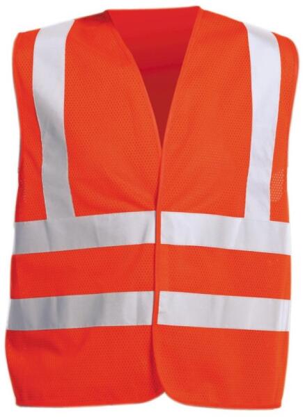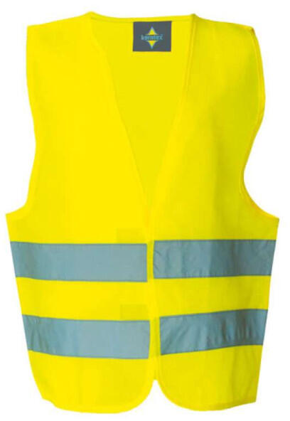 Jól láthatósági mellény Alapanyag: 100 % poliészter A termék megfelel az EN 340, EN 471 szabványoknak. Jól láthatósági mellény fényvisszavető csíkokkal, EN 471: 2,2 3 fényvisszavető csíkkal amiknek a szélessége 5 cm Tépőzáras, fekete kontrasztos szegéssel