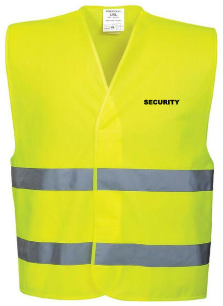 Jól láthatósági mellény biztonsági őrök részére cikkszáma: B474 A termék megfelel az EN471 class 2:2 szabványnak. A C474 típussal megegyező tulajdonságokkal rendelkező mellény, két egyenként 5 cm széles, fényvisszaverő párhuzamos csíkkal. A méret tépőzárral szabályozható. Anyaga: 100 % poliészter A melllény elején lévő security felirat mérete: 8,5 cm X 1.3 cm A