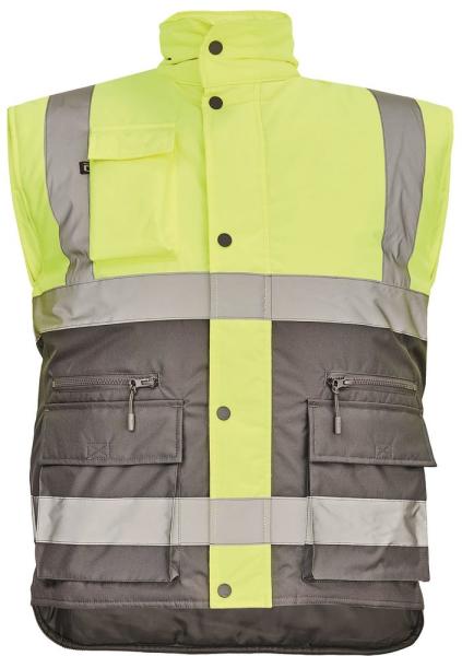 Szigetelt fényvisszaverő férfi mellény figyelmeztető és kiegészítő színek kombinációjában. A jobb láthatóság és a biztonság növelése érdekében fényvisszaverő csíkokkal van ellátva a vállon és a csípőn. A gallérjában rejtett kapucni található. Cipzáras rögzítés, melyet egy patentos hajtóka fed. A mellény két elülső multifunkcionális zsebbel rendelkezik, h