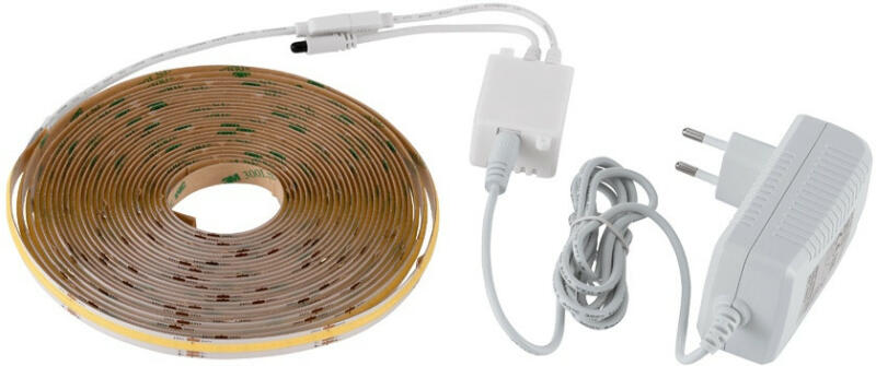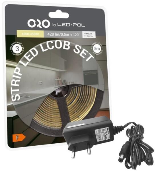 ORO-STRIP-320L-LCOB-NWD-DW -SET LED SZALAG, F, 7,8W/1m, 17,5 W/5, 820lm/1m, 4000K (ORO09085) Termé kinformáció: A készlet tartalmazza az LCOB szalagot, a tápegységet, a vezérlőt és a távirányítót. Alkalmazás: A LED-csíkok ideálisak álmennyezetek, lépcsők, tükrök, fülkék és bútorok megvilágítására Műszaki adatok: Feszültség : 220-240V/AC Teljesítmény: 4W / 0.5 mb,