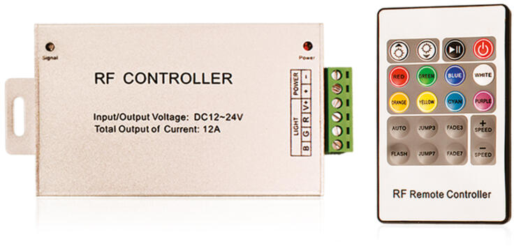 ORO-STEROWNIK-RGB-4 LED SZALAG VEZÉRLÉS, 144W (ORO20012) Termé kinformáció: A kínált vezérlő távirányítóval együtt kerül forgalomba. A köztük lévő kommunikáció rádióhullámok segítségével történik, ami lehetővé teszi, hogy a vezérlő bárhová elrejthető legyen. A készletet úgy tervezték, hogy RGB csíkokkal működjön. Lehetővé teszi a fokozatos vagy sima sz
