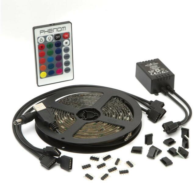 Phenom 55850A LED szalag szett tartalma: 2 darab 50 cm hosszú RGB LED szalag 2 darab 30 cm hosszú RGB LED szalag 3 darab 36,5 cm hosszú csatlakozó kábel 4 lyukú véggel 10 darab 4 tűs csatlakozó 1 darab 90 cm hosszú kábel, egyik végén USB, másik végén DC csatlakozóval 1 darab infravörös RGB vezérlőegység (5V) 1 darab 24 gombos távirányító 10 darab öntapadós kábelrögzí