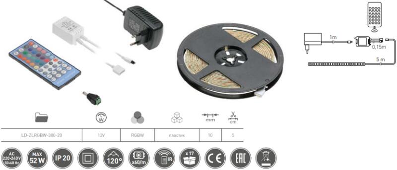 4 az 1-ben, négy LED egyben (további fehér szín) Csávsűrűség 60 LED/m Csatlakozásra kész készlet: szalag, LED meghajtó, vezérlő