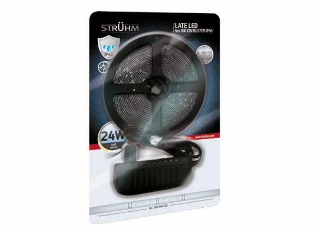 Strühm Late Led Led szalag szett dekoratív termék. Megvásárolható meleg fehér, hideg fehér és natúr fehér színben. Vízálló led szalag, vízvédettsége IP65. A termék magassága 2 mm, hossza 5000 mm és szélessége 8 mm. Vágása 3 ledenként lehetséges. Fogyasztás / m 24 W. Vízállósági szint IP65 LEDek száma/méter 60 LED. Szélesség 8 mm. Fényerő / m 2100 lumen. LEDek