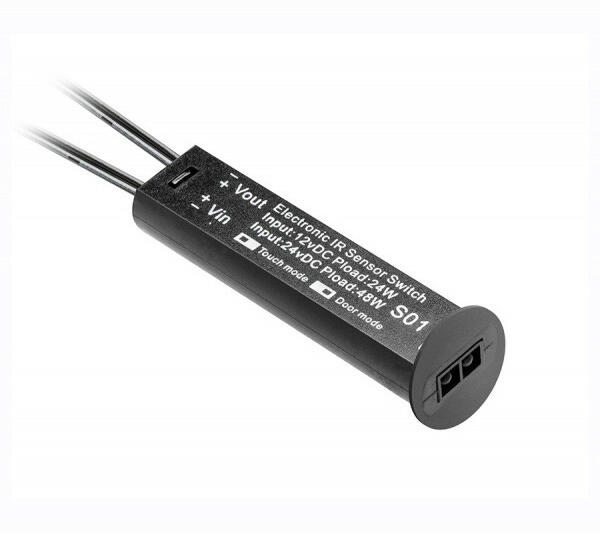 Többfunkciós IR szenzoros kapcsoló LED szalag világításhoz, fekete színben. használható ajtónyitás kapcsolóként (nyitásra felkapcsol-zárásra lekapcsol) vezérelhető kézzel, 5cm-en belül érzékeli a mozgást. A kéz elhúzására be-ki kapcsol. Amennyiben 1mp-nél hosszabb ideig tartja az érzékelő hatótávján belül a kezét a csatlakoztatott LED szalag fényerejét szabál