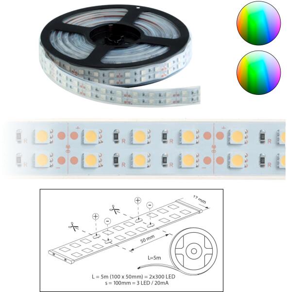 Flexible LED strip with a CRI >90 Flexible LED strip for decorative lighting High-grade components and a solid construction guarantee a long service life and excellent color rendering Can be cut into segments of variable size Self-adhesive rear side Supplied on a plastic reel Power cable, straight and flexible plug connectors available as accessories 300 powerful LEDs SMD 3528 warm white (WW) C