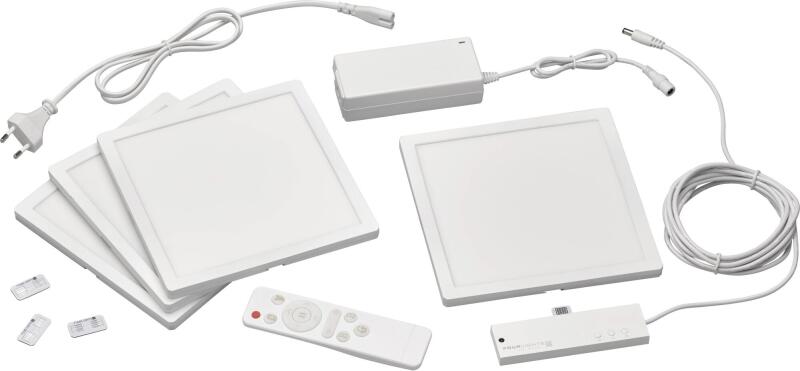 WOFI Germany moduláris fénypanelből álló készlet, LED RGBW távirányítóval, szabályozható, 4 színváltó program, tápegységet tartalmaz, 4 db Engedje szabadjára fantáziáját a Wofi Four Lights világítópanelekkel. Készítsen egyedi világítást falára vagy mennyezetére, amely szokatlan kialakításával biztosan felkelti a figyelmet. Az elrendezési lehetőségek változatos