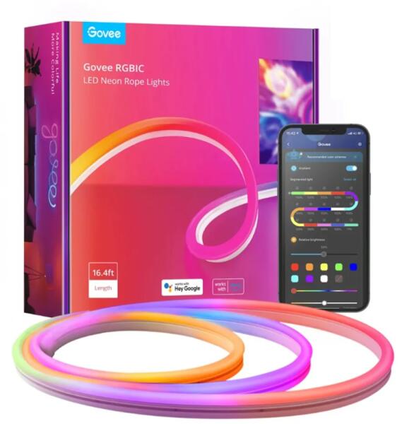Govee - RGBIC Neon LED Fénycső (5 méter, flexibilis) Rugalmas világítás az Ön igényei szerint Hangvezérlés Zene mód Intelligens alkalmazásvezérlés RGBIC effektusok DIY mód Lenyűgöző karácsonyi dekorációhoz Szegmentált RGBIC effektusok Használja a Govee Home App alkalmazást, hogy hozzáférjen a személyes esztétikájához legjobban illő fényeffektusokhoz. Fénye különf