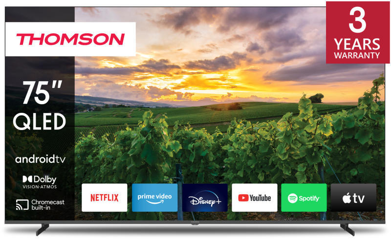 Televízió - Google TV, QLED, 191 cm-es képátló, 4K Ultra HD, 50 / 60 Hz, HDR10+, Dolby Vision, DVB-T2/S2/C, 4× HDMI, 3× USB, CI+, felvétel USB-re, WiFi, Bluetooth, DLNA, Chromecast, Miracast, HbbTV, hangvezérlés, Google Assistant, VESA 200×200, 24 W hangszóró, Dolby Atmos, DTS Digital Surround, Dolby Digital +, tükröződésmentes képernyő, F energiaosztály
