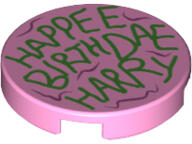 LEGO Alkatrészek 14769pb459c104 - LEGO világos rózsaszín csempe 2 x 2 méretű, kerek, alján bütyök foglalattal, HAPPEE BIRTHDAE HARRY felirattal. LEGO Építési útmutató kódszám: 6341786