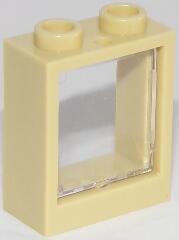 LEGO Alkatrészek 60592c01c2 - LEGO világos krémszínű (tan) ablakkeret 1 x 2 x 2 méretű, átlátszó üveggel.