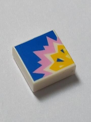 LEGO Alkatrészek 3070bpb158c1 - LEGO fehér csempe 1 x 1 méretű, kék hátteren világos rózsaszín és sárga robbanás mintával.
