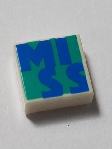 LEGO Alkatrészek 3070bpb157c1 - LEGO fehér csempe 1 x 1 méretű, sötét türkiz hátteren kék MISS felirat mintával.