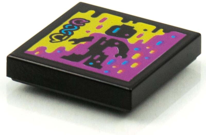 LEGO Alkatrészek 3068bpb1567c11 - LEGO fekete csempe 2 x 2 méretű, sárga lila alapon fekte minifigura mintával.