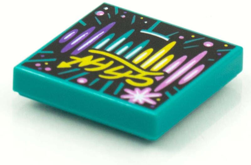 LEGO Alkatrészek 3068bpb1608c39 - LEGO sötét türkiz csempe 2 x 2 méretű, kék, sárga, lila és rózsaszín csíkokkal.