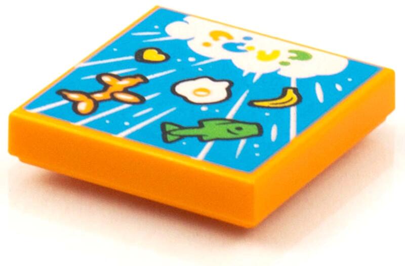 LEGO Alkatrészek 3068bpb1591c4 - LEGO narancssárga csempe 2 x 2 méretű, eső hal, banán, tojás és lufi mintával.