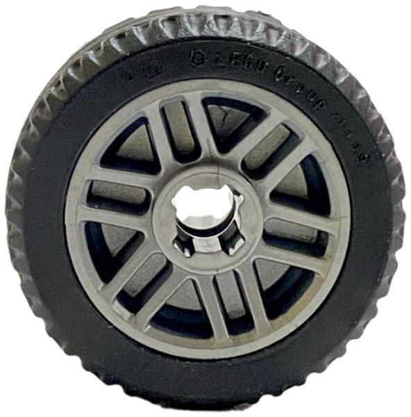 11208c01c95 - LEGO matt ezüst csillag mintájú 14 x 9.9 mm méretű felni belső peremmel, 21mm x 9.9mm fekete gumival