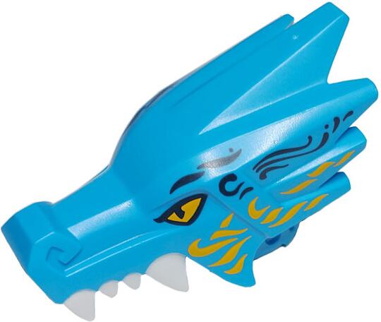 LEGO Alkatrészek 65428pb04c153 - LEGO sötét azúr sárkányfej (Ninjago), felső állkapocs, 4 fehér foggal mindkét oldalon, sárga szemekkel, mintákkal. LEGO Építési útmutató kódszám: 6385398