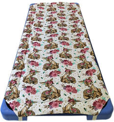 Őzike mintás 55x130 cm óvodás töltött gumifüles lepedő pamut borítással. A lepedő a 4 sarkán lévő gumipánttal rögzíthető a kiságy lábaihoz. Borítás: 100% pamut Töltet: Polyester méret: 55x130 cm (+/- 3 cm) Mosás: 40 °C Rugalmas, mosható töltőanyaggal és kellemes tapintású külső borítással készült. Az óvodákban a kiságyak manapság egymásra rakható műanya