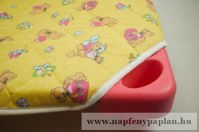 Óvodai fektetőre ráhúzható steppelt ágyvédő Méret: 62x135 (műanyag óvodai és bölcsödei fektetőre) Borítása: 50% pamut - 50% poliészter, 135g / m2, gyermekmintás textília. Tötlet: 100% poliészter, 150g/m2 vlies. Tulajdonság: 40°C-on mosható. Kétoldali mintás A lepedő anyaga 50% pamut - 50% poliészter szálakból szőtt vászonkötésű textília, mely a könnyen kezelhe