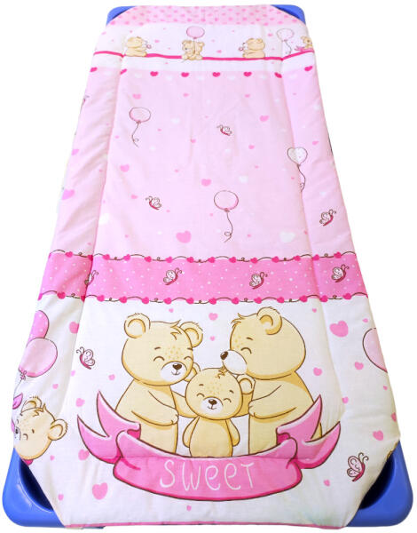 55x130 cm méretű gumifüles lepedő - Rózsaszín Édes Maci Család mintás mintával. A lepedő a 4 sarkán lévő gumipánttal rögzíthető a kiságy lábaihoz. Borítás: 100% pamut Töltet: Polyester méret: 55x130 cm (+/- 3 cm) Mosás: 40 °C-on. Rugalmas, mosható töltőanyaggal és kellemes tapintású külső borítással készült. Az óvodákban a kiságyak manapság egymásra rakha
