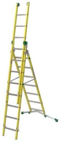 Üveglaminát két részes létra a fokozott kockázatú elektromos kisüléses üzemekbe alkalmas. A létra tanúsítvánnyal rendelkezik, és megfelel az EN 131 és az EN 61478 szabványoknak, I. kategória - 30.000 Volt. Összeállítható álló kettes létraként vagy kitolható és támasztó létraként. Stabilizációs teleszkópos 83 cm – 128 cm széles bázis, műanyag csúszásgátló